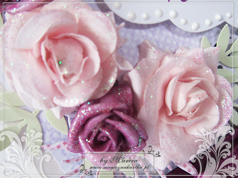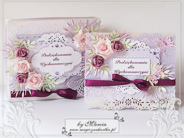 Pierwszy komplet to podziękowanie od uczniów dla ich wychowawczyni za 3 wspólnie spędzone lata. Praca cała w różach i fioletach, ażurowa, z motylkami: